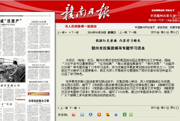 截止目前,公司對外報送群眾路線新聞25篇,編發(fā)簡報4期,更新宣傳園地展板4塊,在市級媒體刊發(fā)群眾路線新聞1篇。值得一提的是,公司結合國企思想政治工作特點,圍繞“習近平總書記重要講話”“紅色經(jīng)典”“群眾調查經(jīng)典著作”“振興發(fā)展”“全面深化改革”等專題自編了12本學習讀本,為教育實踐活動的深入、有效開展提供了極好的教材和資料藍本。這一做法受到市委教育實踐活動第33督導組的高度認可,4月20日《贛南日報》也對此進行了報道,成為集團公司開展教育實踐活動的特色之一。