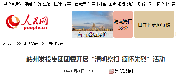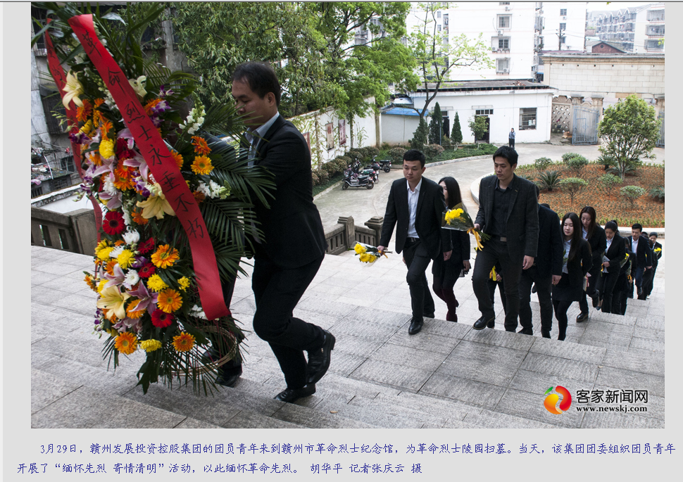 【編者按】3月30日,《人民日?qǐng)?bào)》旗下的“人民網(wǎng)”、“中國(guó)文明網(wǎng)”、“客家新聞網(wǎng)”、《贛州晚報(bào)》等多家新聞媒體先后報(bào)道了贛州發(fā)展集團(tuán)團(tuán)委組織開展的“清明祭掃  緬懷先烈”活動(dòng),弘揚(yáng)了正氣,同時(shí)也充分展現(xiàn)了集團(tuán)團(tuán)干、團(tuán)員青年積極踐行集團(tuán)核心理念的良好精神風(fēng)貌。