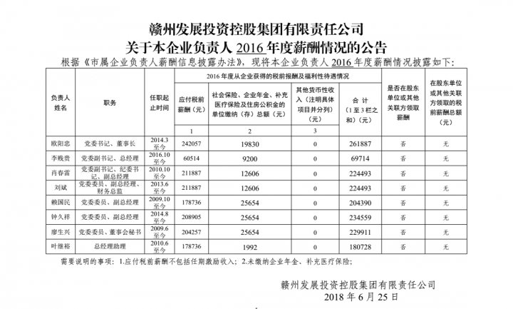 關(guān)于本企業(yè)負(fù)責(zé)人2016年度薪酬情況的公告