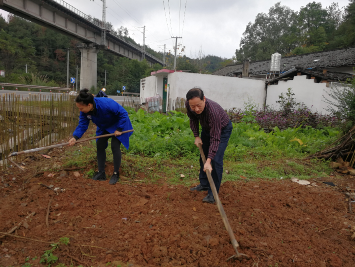(與貧困戶一起在菜園翻地)