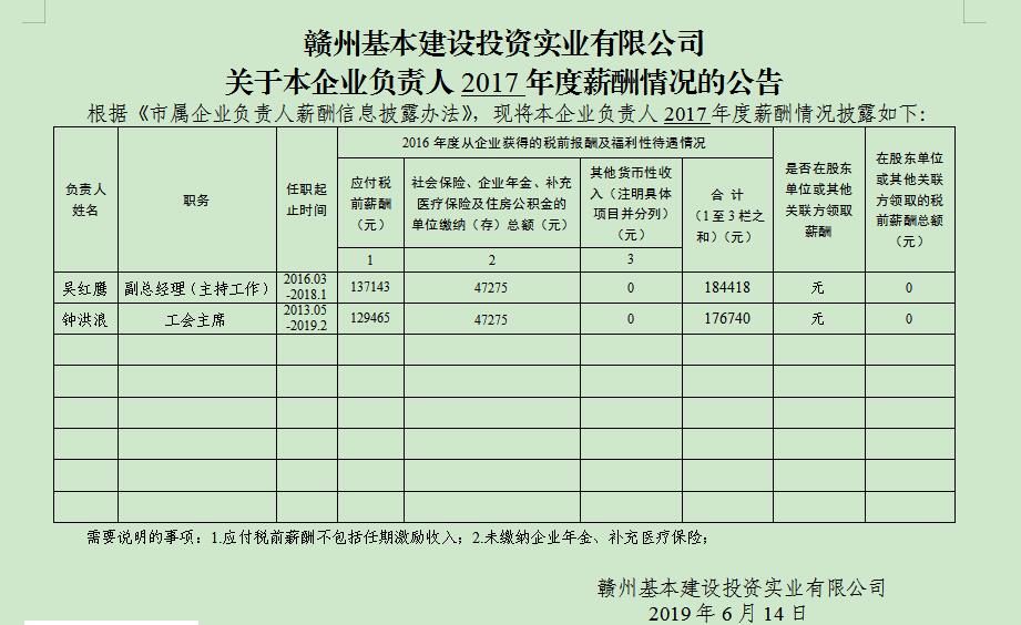 贛州基本建設投資實業(yè)有限公司 關于本企業(yè)負責人2017年度薪酬情況的公告