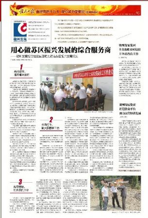 主題報(bào)道以《用心做蘇區(qū)振興發(fā)展的綜合服務(wù)商》為題,由三部分組成。第一部分主要從戰(zhàn)略層面入手,闡述了我公司立志做贛南蘇區(qū)振興發(fā)展綜合服務(wù)商的初衷、方向和路徑。第二部分從市場運(yùn)作的角度,描述了我公司勇挑重?fù)?dān),為民生不辱使命的歷程,表明了我公司用心做贛南蘇區(qū)振興發(fā)展綜合服務(wù)商的堅(jiān)強(qiáng)意志。第三部分主要從以打造現(xiàn)代型企業(yè)為目標(biāo),加強(qiáng)企業(yè)自身管理和建設(shè)的角度,闡述了公司的核心價(jià)值觀,客觀描述了我公司法人治理、企業(yè)文化和承擔(dān)社會(huì)責(zé)任的作為和成效。