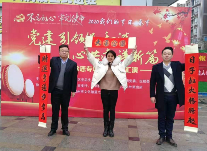 次日,贛州發(fā)投集團黨委和社區(qū)黨總支共同舉辦了“黨建引領促和諧 同心共建譜新篇‘不忘初心、牢記使命’”春節(jié)文藝匯演。在寒風瑟瑟的演出現(xiàn)場,集團員工黃博滔、閆曉龍冒著細雨熱情洋溢地為觀眾獻上了歌曲“紅旗飄飄”,并向現(xiàn)場觀眾表達誠摯的新春祝福,獲得了在場觀眾熱烈地掌聲。