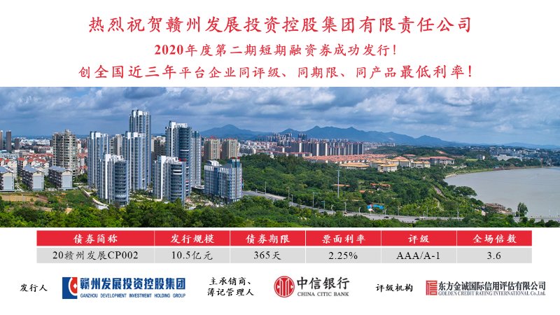 4月16日,集團2020年第二期短期融資券成功發(fā)行,發(fā)行規(guī)模10.5億元,期限1年,票面利率2.25%,創(chuàng)全國近三年平臺企業(yè)同評級、同期限、同產(chǎn)品最低利率。