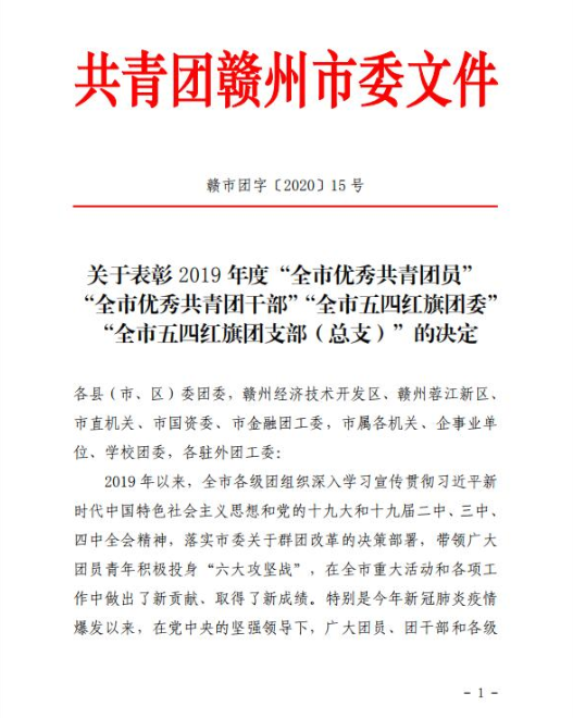 5月4日,共青團贛州市委對2019年度全市“兩紅兩優(yōu)”進行表彰,集團團委再次榮獲“全市五四紅旗團委”榮譽稱號。鄺宏國同志榮獲“全市優(yōu)秀共青團干部”榮譽稱號,供應鏈管理公司法務專員鄢欣榮獲“全市優(yōu)秀共青團員”榮譽稱號。