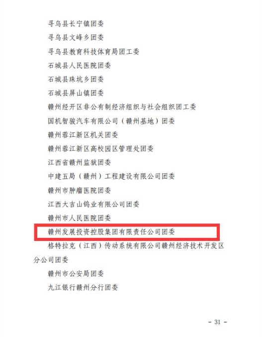 近年來,集團黨委高度重視團建工作,以黨建帶群建,大力支持團組織創(chuàng)造性開展工作,充分發(fā)揮黨的助手和后備軍作用。集團團委在集團黨委的正確領導和共青團贛州市委、市國資委團工委的精心指導下,創(chuàng)新“四融工作法”,引領廣大團員青年緊跟黨走,先后冠名了“金控杯”贛州市第四屆青年歌手大賽和承辦了贛州市青少年首屆紅色歌曲合唱大賽;相繼開展了紀念五四運動100周年“五個一”活動,人民網(wǎng)等主流媒體紛紛進行了宣傳報道。特別是在2020年抗疫期間,集團團委聞令而動,迅速成立了青年突擊隊,做到特殊時期業(yè)務“不斷”、志愿服務“不斷”。加班加點創(chuàng)造條件為醫(yī)藥企業(yè)等重點民生產(chǎn)業(yè)、受疫情影響的企業(yè)累計投資或延期還款計劃5.45億元。主動聯(lián)系贛州市中心血站組織開展了“學雷鋒見行動”義務獻血活動。集團團委先后榮獲“省級青年文明號單位”“全省五四紅旗團委”“全市五四紅旗團委”等榮譽稱號。