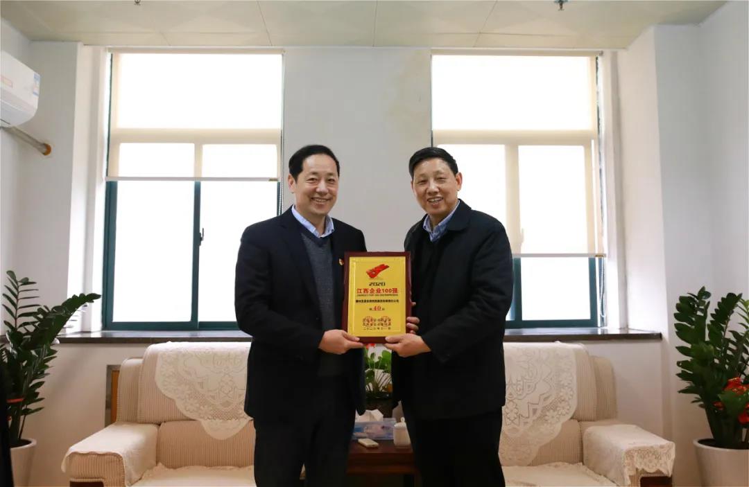 1月26日上午,贛州市企業(yè)聯(lián)合會會長劉琮、常務(wù)副會長兼秘書長李勃一行蒞臨贛州發(fā)展集團(tuán),向集團(tuán)黨委副書記、總經(jīng)理?xiàng)顣员笫谟琛?020江西企業(yè)100強(qiáng)第40強(qiáng)”獎(jiǎng)牌。集團(tuán)在家的領(lǐng)導(dǎo)班子成員參加了座談。