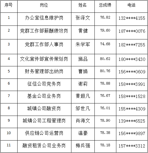 根據《贛州發(fā)展投資控股集團應屆畢業(yè)生招聘公告》規(guī)定的程序,按照筆試成績占40%,面試成績占60%的比例計算總成績,由高到低的順序,按1:1的比例確定進入背景調查和體檢的擬錄用人選,直接進入面試的以面試成績作為總成績,現將入闈體檢及背景調查名單公告如下: