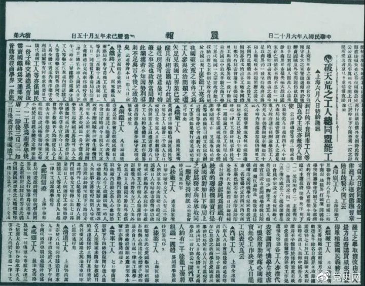 1919年6月3日以后,上海工人率先罷工,使五四愛國運(yùn)動(dòng)進(jìn)入新的階段。圖為北京《晨報(bào)》關(guān)于上海六、七萬工人總同盟罷工的報(bào)道。