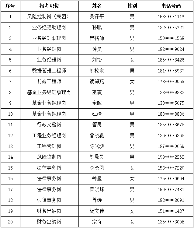 根據(jù)《贛州發(fā)展投資控股集團(tuán)公開招聘公告》有關(guān)規(guī)定,通過公開報(bào)名、簡歷初審、資格審查、筆試、面試(其中研究生單獨(dú)兩輪面試)、體檢與背調(diào)等程序,經(jīng)研究,確定以下20名同志為擬錄用人員,現(xiàn)予以公示: