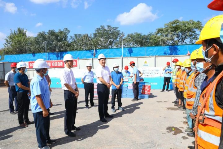 在項(xiàng)目現(xiàn)場(chǎng),胡劍飛詳細(xì)了解了項(xiàng)目基本情況、規(guī)劃設(shè)計(jì)、施工進(jìn)度以及“十一”期間生產(chǎn)安排、安全生產(chǎn)、疫情防控等情況,協(xié)調(diào)解決困難和問題??吹焦と藗冋诩泳o施工的繁忙景象,胡劍飛為一線施工人員送上了慰問品,向堅(jiān)守一線崗位的廣大勞動(dòng)者致以節(jié)日的問候。他強(qiáng)調(diào),要搶抓項(xiàng)目施工黃金期,爭(zhēng)分奪秒趕進(jìn)度,在保障項(xiàng)目質(zhì)量和安全、疫情防控的前提下,進(jìn)一步加快項(xiàng)目建設(shè)步伐,確保項(xiàng)目如期完工。