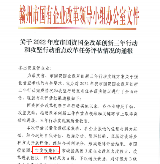 近日,贛州市國有企業(yè)改革領導小組辦公室對在2022年我市國資國企改革創(chuàng)新三年行動完成情況和攻堅行動重點任務落實工作中改革力度較大、改革進展較快的市屬國有企業(yè)進行了表彰,其中,贛州發(fā)投集團榜上有名,獲得2022年度市國資國企改革創(chuàng)新三年行動和攻堅行動重點改革任務評估為A級。這是贛州發(fā)投集團繼2021年獲市國資國企改革創(chuàng)新三年行動重點改革任務評估為A級之后,再次獲此殊榮。