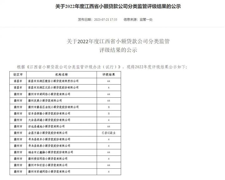 近日,江西省地方金融監(jiān)督管理局發(fā)布《關于2022年度江西省小額貸款公司分類監(jiān)管評級結(jié)果的公示》,其中贛州發(fā)展小額貸款有限公司在評級考核中以高分獲評“AA”評級,得到省地方金融監(jiān)管局監(jiān)管處室和省小貸行業(yè)協(xié)會的高度認可。