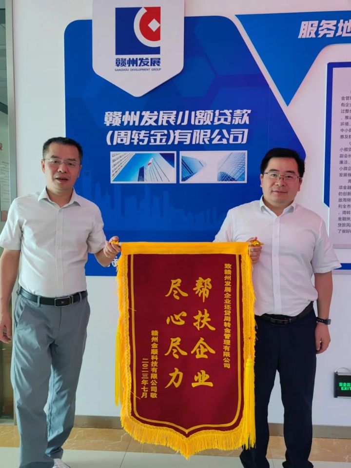 8月11日,贛州金順科技有限公司送來一面寫有“幫扶企業(yè) 盡心盡力”的錦旗,對贛州發(fā)展企業(yè)還貸周轉(zhuǎn)金管理有限公司以專業(yè)、周到的服務為企業(yè)解決融資難題表示衷心的感謝。