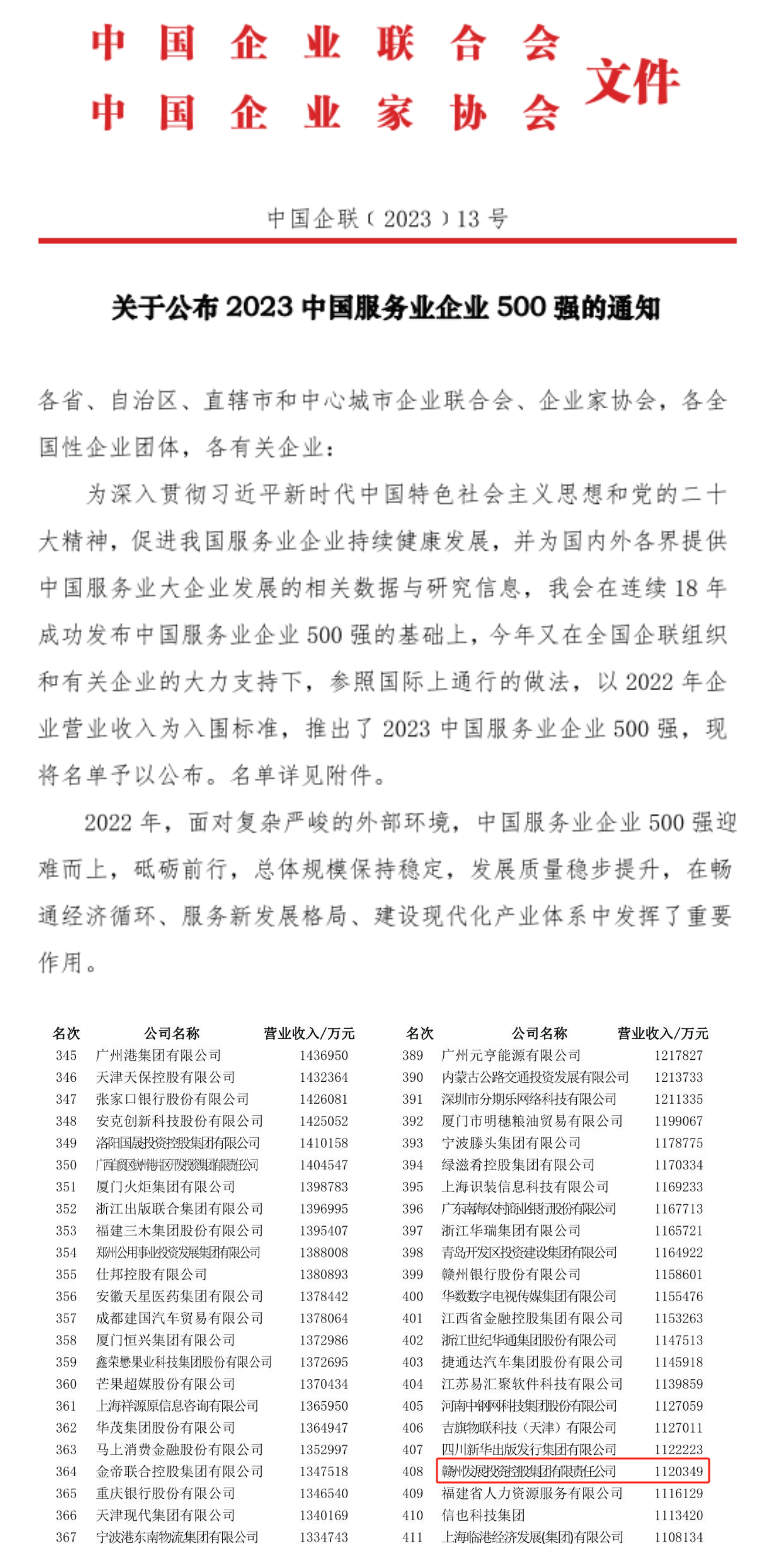 喜訊!贛州發(fā)展集團(tuán)榮列中國(guó)服務(wù)業(yè)企業(yè)500強(qiáng)