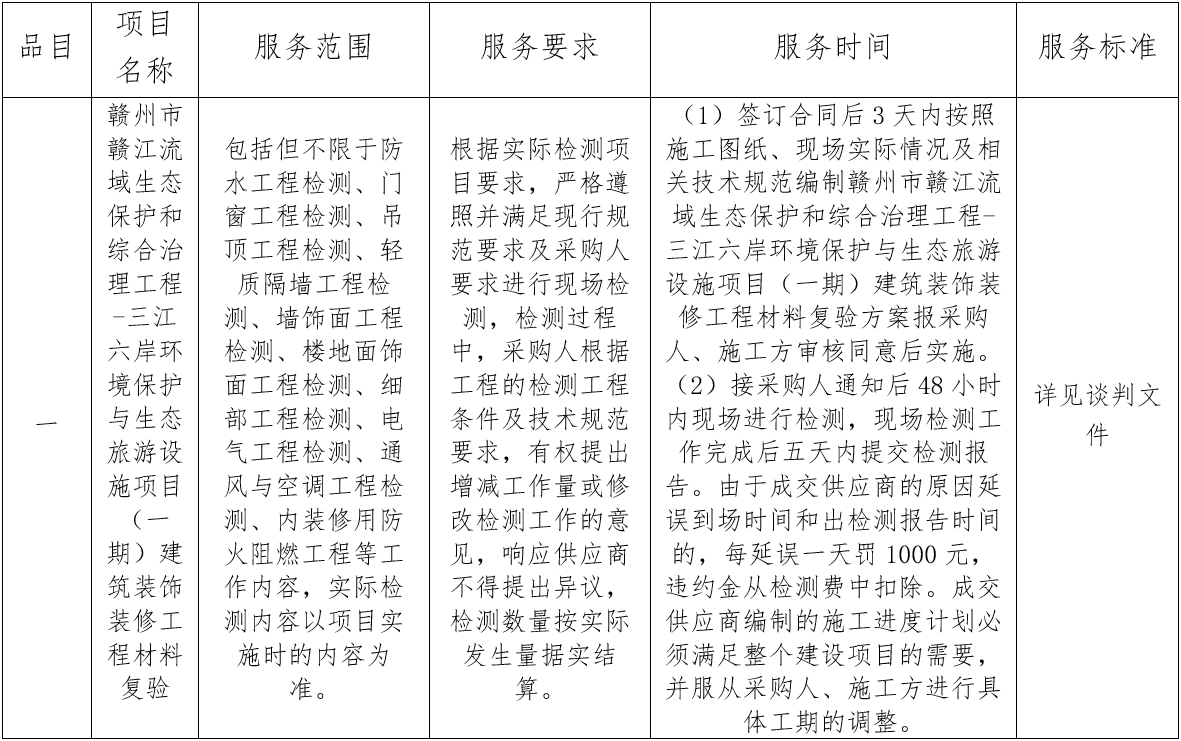 贛州市贛江流域生態(tài)保護(hù)和綜合治理工程-三江六岸環(huán)境保護(hù)與生態(tài)旅游設(shè)施項(xiàng)目(一期)建筑裝飾裝修工程材料復(fù)驗(yàn)競(jìng)爭(zhēng)性談判成交結(jié)果公告