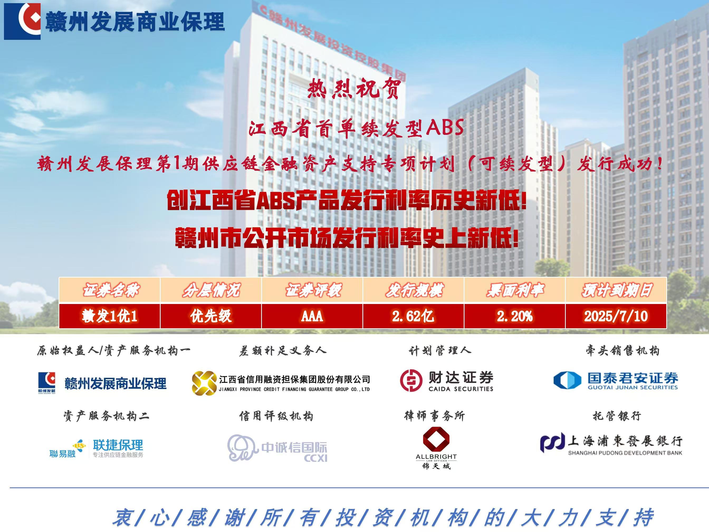 8月5日,贛州發(fā)展集團旗下保理公司“贛州發(fā)展保理第1期供應(yīng)鏈金融資產(chǎn)支持專項計劃(可續(xù)發(fā)型)”成功簿記!簿記發(fā)行規(guī)模2.63億元,期限1年,其中優(yōu)先級規(guī)模2.62億元,評級AAAsf,票面利率2.2%。8月9日募資全部到位。本產(chǎn)品系江西省首單續(xù)發(fā)型ABS,發(fā)行利率創(chuàng)江西省ABS產(chǎn)品發(fā)行利率歷史新低,創(chuàng)贛州市公開市場發(fā)行利率史上新低。